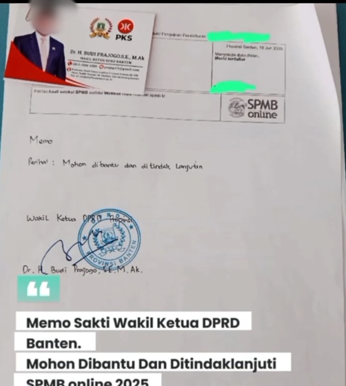 Cilegon, jurnalfakta1.com – Wakil Ketua DPRD Provinsi Banten, Budi Prajogo, menjadi pusat perhatian publik setelah memo berisi titipan siswa dalam proses seleksi Sistem Penerimaan Murid Baru (SPMB) salah satu SMA Negeri di Kota Cilegon tersebar luas di media sosial. Memo tersebut memuat tulisan tangan bertajuk “Memo mohon dibantu dan ditindaklanjuti,” lengkap dengan nama, jabatan, tanda tangan, serta cap resmi DPRD Provinsi Banten.