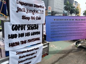 “Kami minta Satpol PP jangan tebang pilih. Kalau warga kecil, pedagang kaki lima, cepat ditindak. Tapi kalau ‘kenal’ dan sudah 86, bisa-bisanya diam seribu bahasa. Ini jelas mencederai rasa keadilan,” teriak salah satu orator aksi dari atas mobil komando.