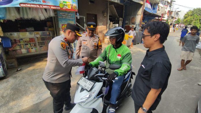 JAKARTA BARAT, jurnalfakta1.com — Menyambut Hari Ulang Tahun ke-80 Kemerdekaan Republik Indonesia, Polsek Tambora membagikan 300 bendera merah putih secara gratis kepada warga, Selasa (5/8/2025). Kegiatan berlangsung di depan Pos RW 09, Jalan Petak Kodok, Kelurahan Angke, Tambora, Jakarta Barat, dan dipimpin langsung oleh Kapolsek Tambora, Kompol Muhammad Kukuh Islami.