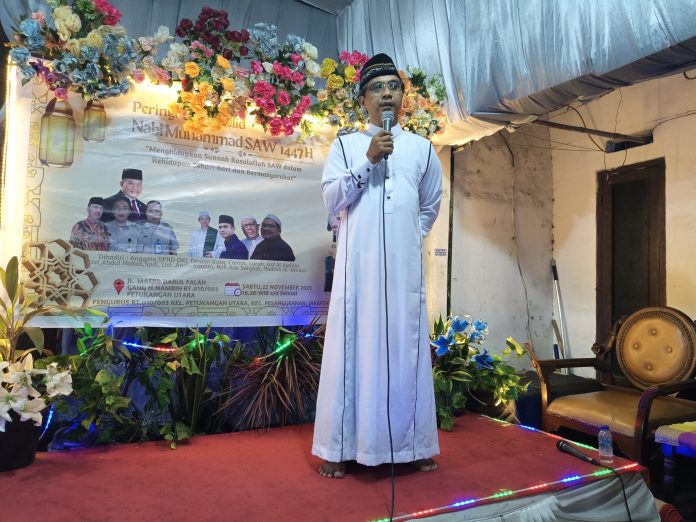 JAKARTA SELATAN, jurnalfakta1.com — Suasana hangat penuh kekhusyukan menyelimuti Jalan Masjid, Gang H. Nambih, Kelurahan Petukangan Utara, Kecamatan Pesanggrahan, Sabtu malam Minggu (22/11/2025) sekitar pukul 18.30 WIB. Rukun Tetangga (RT) 10 dan Rukun Warga (RW) 3 menggelar peringatan Maulid Nabi Besar Muhammad Shallallahu ‘alaihi wasallam ke-1447 Hijriah dengan tema “Menghidupkan Sunnah Rasulullah SAW dalam Kehidupan Sehari-hari dan Bermasyarakat.”