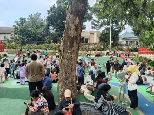 Sejak pagi hingga sore hari, kawasan taman terlihat dipenuhi warga yang datang bersama keluarga, teman, maupun pasangan. Mereka memanfaatkan momen libur untuk bersantai, berfoto, hingga berolahraga ringan di area terbuka hijau yang tertata rapi dan nyaman.